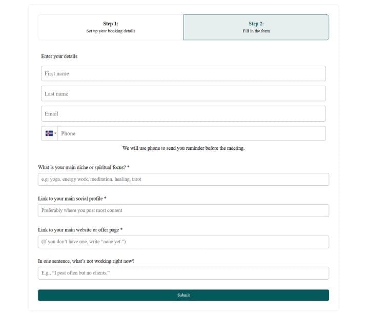 Answer short prep questions: your name, email, phone, niche or spiritual focus, links to main socials and website, and what’s not working right now.