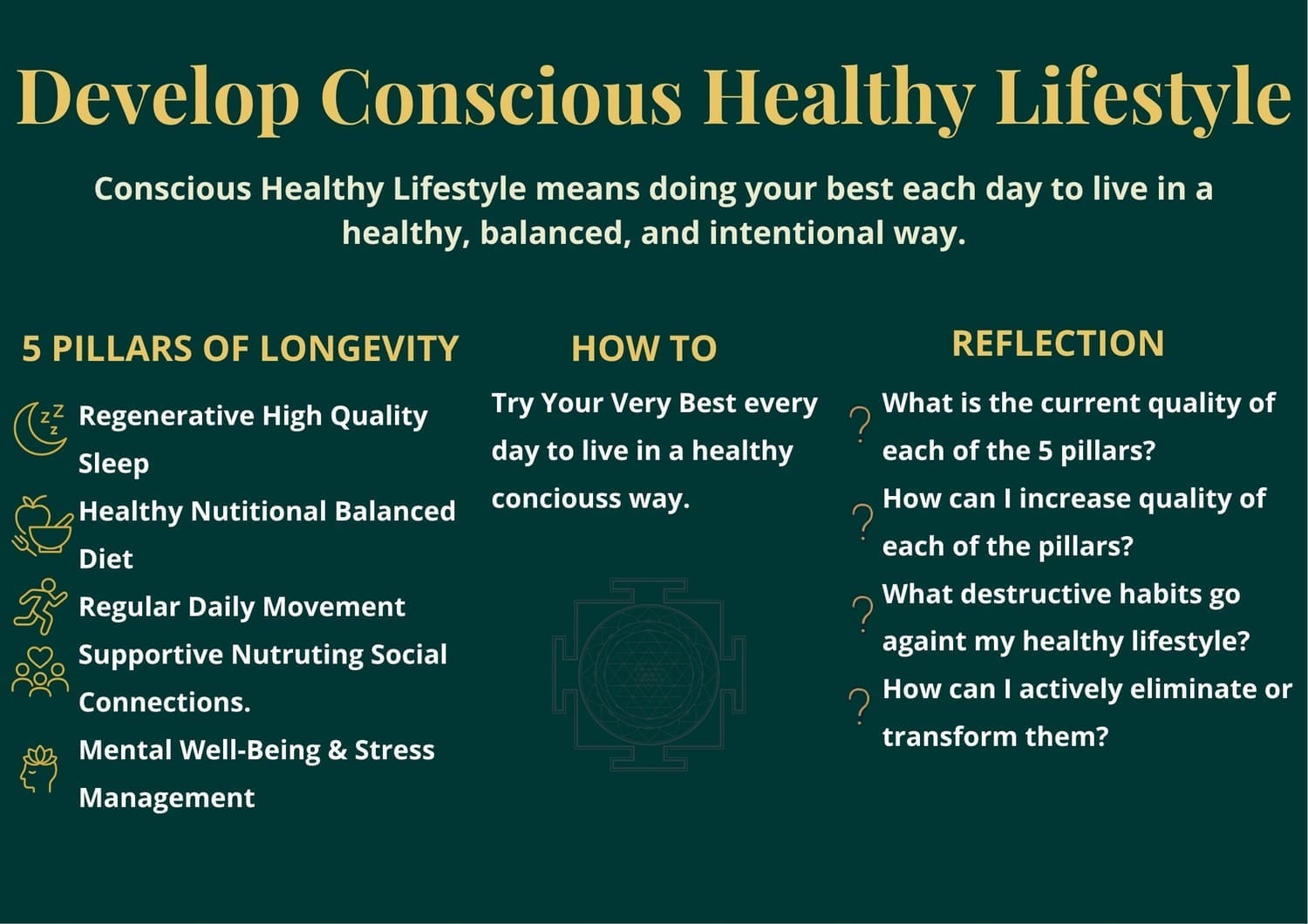 Conscious Healthy Lifestyle means doing your best each day to live in a healthy, balanced, and intentional way. By caring holisticaly for mind body and spirit, you create the inner and outer conditions for consciousness to keep evolving. This approach nurtures overall well-being and vitality, lowers disease risk, supports healthy aging, and leads to a longer, more energetic, and fulfilling life.